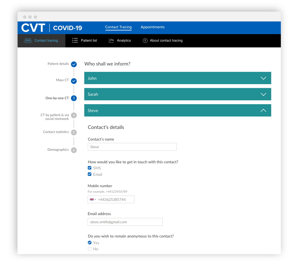 This service enables clinicians or patients diagnosed with COVID-19 to notify people they have been in contact with. It provides their contacts with information about what to do next and allows them to find their nearest clinic and get tested, if necessary.